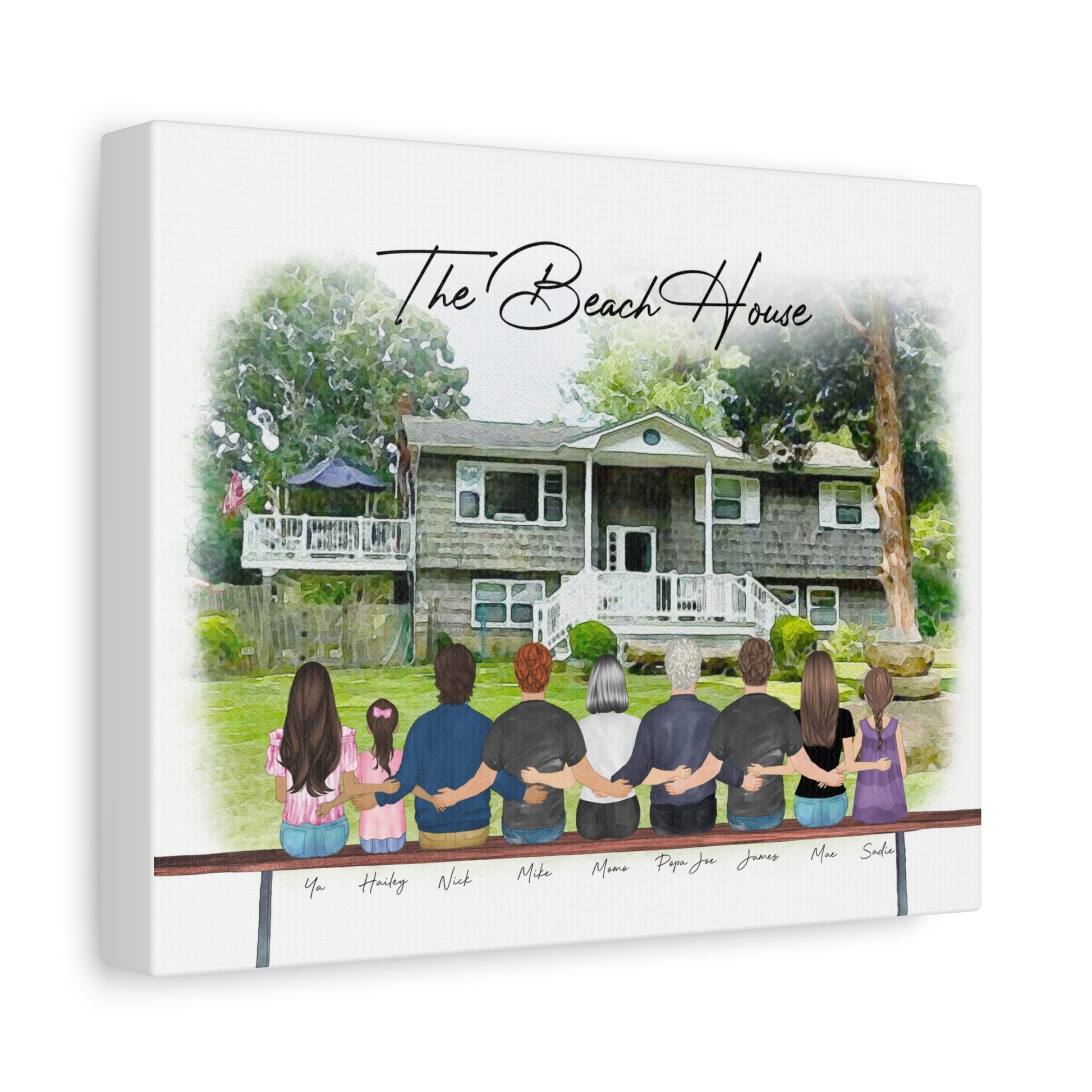 Personalized Family Beach House Canvas — Custom Names & Portraits, Stretched Matte Wall Art